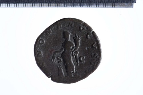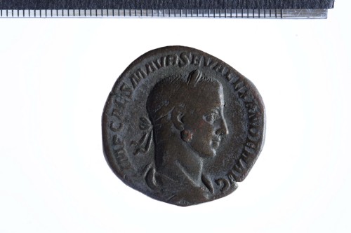 Dritto: Busto laureato di Alessandro Severo a d., con paludamentum, di tre quarti di spalle; contorno perlinato.. Rovescio: Annona stante a s., reggente cornucopia nella s. e spighe nella d. protesa; ai suoi piedi, modius; contorno perlinato.