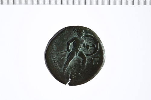 Dritto: Testa laureata di Zeus barbato a d.. Rovescio: Eroe nudo elmato che avanza a d. con lancia e scudo; in campo a s. segno di valore P greco
