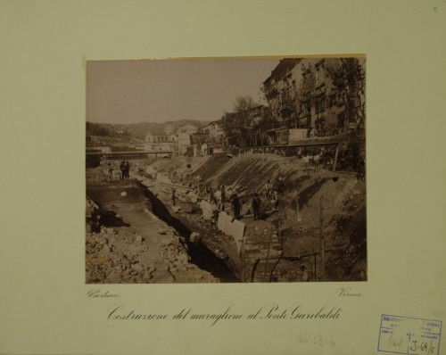- NOTIZIE STORICO CRITICHE I lavori documentati in questa stampa fotografica sono parte del progetto di massima concernente l'assestamento dell'alveo urbano d'Adige di Verona, redatto dalla Commissione Governativa Municipale, diretta dall'ingegner Capo Municipale Emilio Cavalieri. Il progetto fu approvato dal Consiglio Comunale in data 11 settembre 1885, secondo le modifiche redatte al progetto dall'ingegner Capo Municipale Tullio Donatelli; fu riapprovato con delibera dal Consiglio Comunale in data 25 ottobre 1889 e dal Ministero dei Lavori Pubblici con un'ordinanza pervenuta al Comune di Verona il 3 aprile 1890. Il tratto d'alveo d'Adige documentato riguarda la sezione del progetto denominata "Tronco II". I lavori furono realizzati dall'impresa costruttrice Giacomo dott. Laschi tra il 4 febbraio 1890 e il 31 marzo 1894.