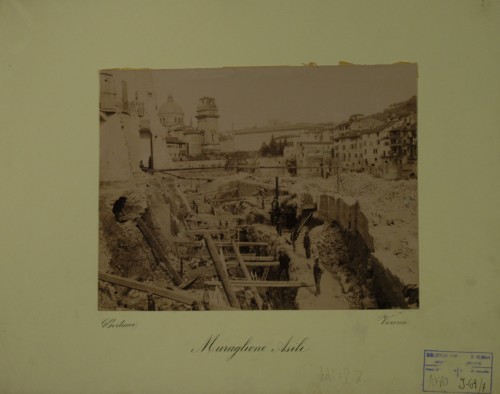- NOTIZIE STORICO CRITICHE I lavori documentati in questa stampa fotografica sono parte del progetto di massima concernente l'assestamento dell'alveo urbano d'Adige di Verona, redatto dalla Commissione Governativa Municipale, diretta dall'ingegner Capo Municipale Emilio Cavalieri. Il progetto fu approvato dal Consiglio Comunale in data 11 settembre 1885, secondo le modifiche redatte al progetto dall'ingegner Capo Municipale Tullio Donatelli; fu riapprovato con delibera dal Consiglio Comunale in data 25 ottobre 1889 e dal Ministero dei Lavori Pubblici con un'ordinanza pervenuta al Comune di Verona il 3 aprile 1890. Il tratto d'alveo d'Adige documentato riguarda la sezione del progetto denominata "Tronco II". I lavori furono realizzati dall'impresa costruttrice Giacomo dott. Laschi tra il 4 febbraio 1890 e il 31 marzo 1894.