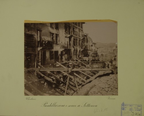 - NOTIZIE STORICO CRITICHE I lavori documentati in questa stampa fotografica sono parte del progetto di massima concernente l'assestamento dell'alveo urbano d'Adige di Verona, redatto dalla Commissione Governativa Municipale, diretta dall'ingegner Capo Municipale Emilio Cavalieri. Il progetto fu approvato dal Consiglio Comunale in data 11 settembre 1885, secondo le modifiche redatte al progetto dall'ingegner Capo Municipale Tullio Donatelli; fu riapprovato con delibera dal Consiglio Comunale in data 25 ottobre 1889 e dal Ministero dei Lavori Pubblici con un'ordinanza pervenuta al Comune di Verona il 3 aprile 1890. Il tratto d'alveo d'Adige documentato riguarda la sezione del progetto denominata "Tronco II". I lavori furono realizzati dall'impresa costruttrice Giacomo dott. Laschi tra il 4 febbraio 1890 e il 31 marzo 1894.