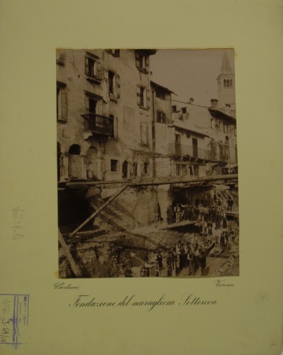 - NOTIZIE STORICO CRITICHE I lavori documentati in questa stampa fotografica sono parte del progetto di massima concernente l'assestamento dell'alveo urbano d'Adige di Verona, redatto dalla Commissione Governativa Municipale, diretta dall'ingegner Capo Municipale Emilio Cavalieri. Il progetto fu approvato dal Consiglio Comunale in data 11 settembre 1885, secondo le modifiche redatte al progetto dall'ingegner Capo Municipale Tullio Donatelli; fu riapprovato con delibera dal Consiglio Comunale in data 25 ottobre 1889 e dal Ministero dei Lavori Pubblici con un'ordinanza pervenuta al Comune di Verona il 3 aprile 1890. Il tratto d'alveo d'Adige documentato riguarda la sezione del progetto denominata "Tronco II". I lavori furono realizzati dall'impresa costruttrice Giacomo dott. Laschi tra il 4 febbraio 1890 e il 31 marzo 1894.