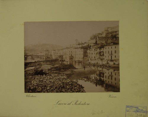 - NOTIZIE STORICO CRITICHE I lavori documentati in questa stampa fotografica sono parte del progetto di massima concernente l'assestamento dell'alveo urbano d'Adige di Verona, redatto dalla Commissione Governativa Municipale, diretta dall'ingegner Capo Municipale Emilio Cavalieri. Il progetto fu approvato dal Consiglio Comunale in data 11 settembre 1885, secondo le modifiche redatte al progetto dall'ingegner Capo Municipale Tullio Donatelli; fu riapprovato con delibera dal Consiglio Comunale in data 25 ottobre 1889 e dal Ministero dei Lavori Pubblici con un'ordinanza pervenuta al Comune di Verona il 3 aprile 1890. Il tratto d'alveo d'Adige documentato riguarda la sezione del progetto denominata "Tronco II". I lavori furono realizzati dall'impresa costruttrice Giacomo dott. Laschi tra il 4 febbraio 1890 e il 31 marzo 1894.