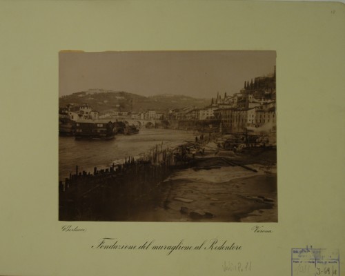 - NOTIZIE STORICO CRITICHE I lavori documentati in questa stampa fotografica sono parte del progetto di massima concernente l'assestamento dell'alveo urbano d'Adige di Verona, redatto dalla Commissione Governativa Municipale, diretta dall'ingegner Capo Municipale Emilio Cavalieri. Il progetto fu approvato dal Consiglio Comunale in data 11 settembre 1885, secondo le modifiche redatte al progetto dall'ingegner Capo Municipale Tullio Donatelli; fu riapprovato con delibera dal Consiglio Comunale in data 25 ottobre 1889 e dal Ministero dei Lavori Pubblici con un'ordinanza pervenuta al Comune di Verona il 3 aprile 1890. Il tratto d'alveo d'Adige documentato riguarda la sezione del progetto denominata "Tronco II". I lavori furono realizzati dall'impresa costruttrice Giacomo dott. Laschi tra il 4 febbraio 1890 e il 31 marzo 1894.