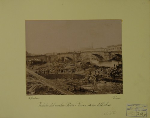 - NOTIZIE STORICO CRITICHE I lavori documentati in questa stampa fotografica sono parte del progetto di massima concernente l'assestamento dell'alveo urbano d'Adige di Verona, redatto dalla Commissione Governativa Municipale, diretta dall'ingegner Capo Municipale Emilio Cavalieri. Il progetto fu approvato dal Consiglio Comunale in data 11 settembre 1885, secondo le modifiche redatte al progetto dall'ingegner Capo Municipale Tullio Donatelli; fu riapprovato con delibera dal Consiglio Comunale in data 25 ottobre 1889 e dal Ministero dei Lavori Pubblici con un'ordinanza pervenuta al Comune di Verona il 3 aprile 1890. Il tratto d'alveo d'Adige documentato riguarda la sezione del progetto denominata "Tronco II". I lavori furono realizzati dall'impresa costruttrice Giacomo dott. Laschi tra il 4 febbraio 1890 e il 31 marzo 1894.