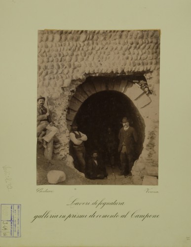 - ISCRIZIONI sul supporto secondario: recto: in basso al centro - Lavori di fognatura galleria in prismi di cemento al Campone - a matita -