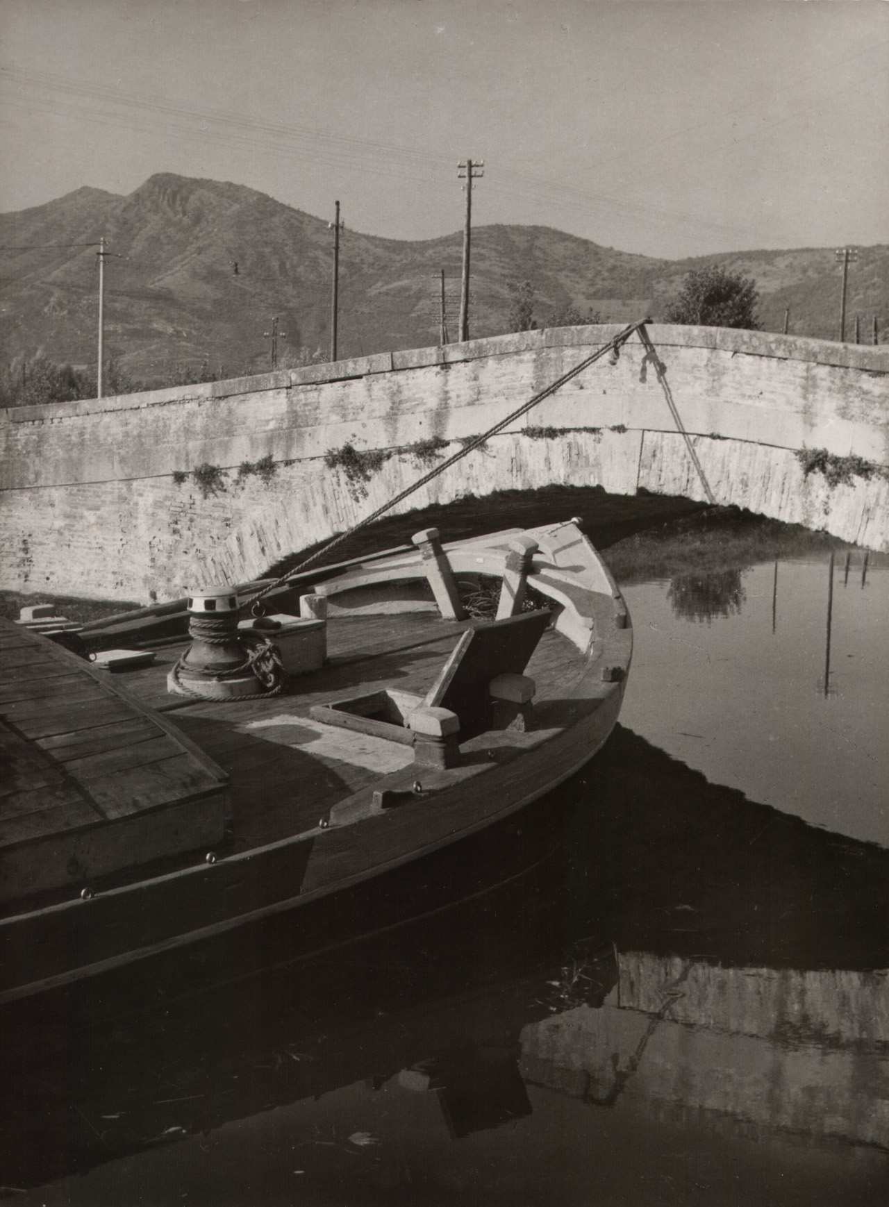 Battaglia Terme, anni '50. Barca trattenuta al Ponte Nuovo con un cavo legato all'argana.