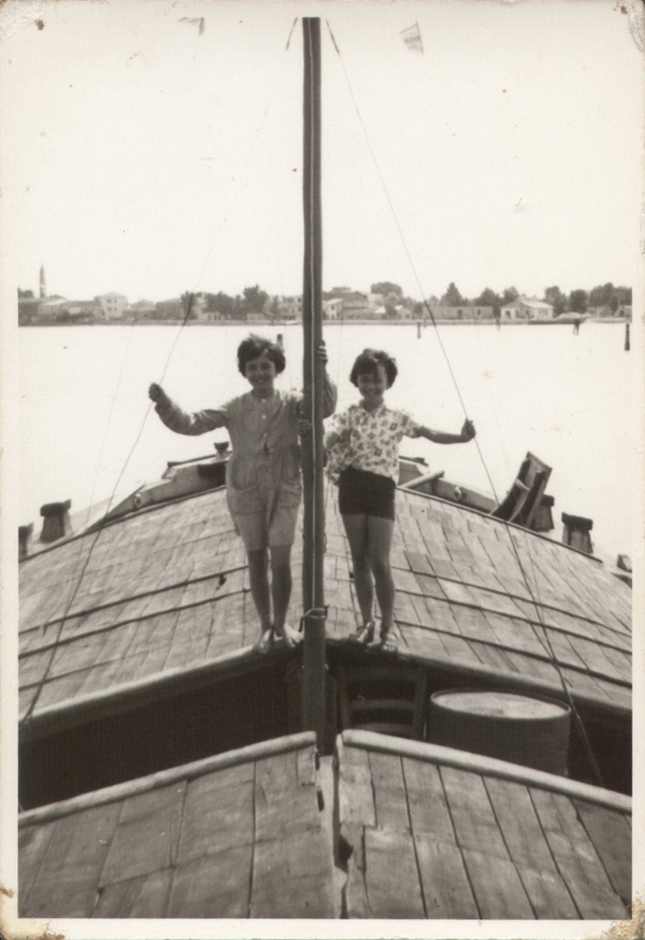 Foto ricordo delle figlie del barcaro Silvestro Fusaro sul burcio Sergio in navigazione nella laguna di Venezia.