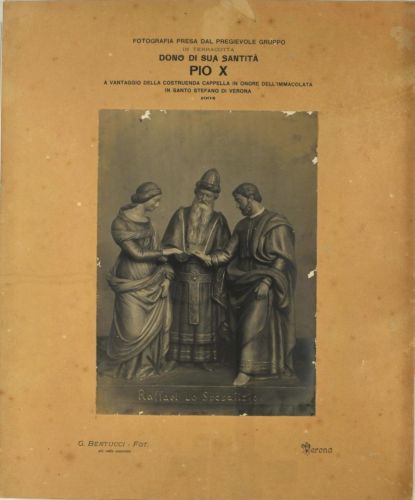 - ISCRIZIONI sul supporto secondario: recto in alto al centro - FOTOGRAFIA PRESA DAL PREGIEVOLE GRUPPO | IN TERRACOTTA | DONO DI SUA SANTITà | PIO X | A VANTAGGIO DELLA COSTRUENDA CAPPELLA IN ONORE DELL'IMMACOLATA | IN SANTO STEFANO DI VERONA | 1904 - a matita -