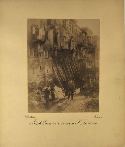 - NOTIZIE STORICO CRITICHE I lavori rappresentati in questa stampa sono una parte di quelli compresi nel progetto di massima redatto, per la sistemazione dell'alveo urbano dell'Adige in Verona, dalla Commissione Governativa Municipale diretta dall'ingegnere Capo Municipale Emilio Cavalieri. Approvato dal Consiglio Comunale in data 11 settembre 1885, secondo la modifica al progetto redatta dall'ingegnere Capo Municipale Tullio Donatelli, approvato con delibera del Cosiglio Comunale in data 25 ottobre 1889, e dal Ministero dei Lavori Pubblici pervenuta al Comune il 3 aprile 1890. Il tratto rappresentato è riferibile alla parte del progetto denominato tronco II. I lavori si svolsero dal 4 febbraio 1890 al 31 marzo 1894 dall'impresa costruttrice Giacomo dott. Laschi vincitrice dell'appalto.