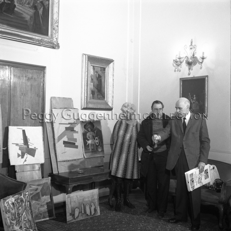 Peggy Guggenheim, Giuseppe Santomaso e Guido Perocco (da sinistra a destra) alla Questura di Venezia, dopo il ritrovamento delle opere rubate a Palazzo Venier dei Leoni, Venezia, 1972.