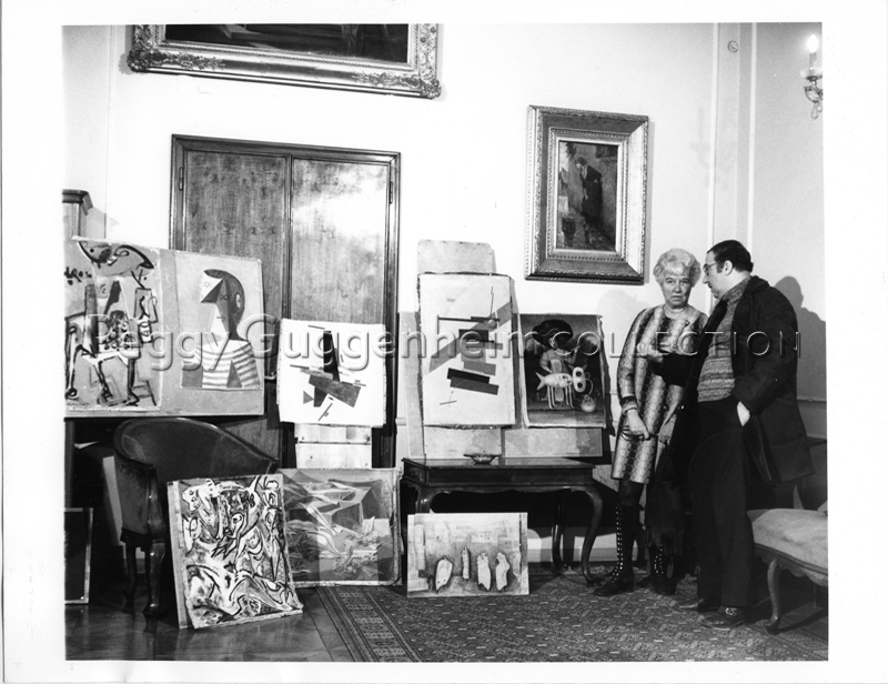 Peggy Guggenheim and Giuseppe Santomaso at the Venice police station after the recovery of the artworks stolen from Palazzo Venier dei Leoni, Venice, 1972