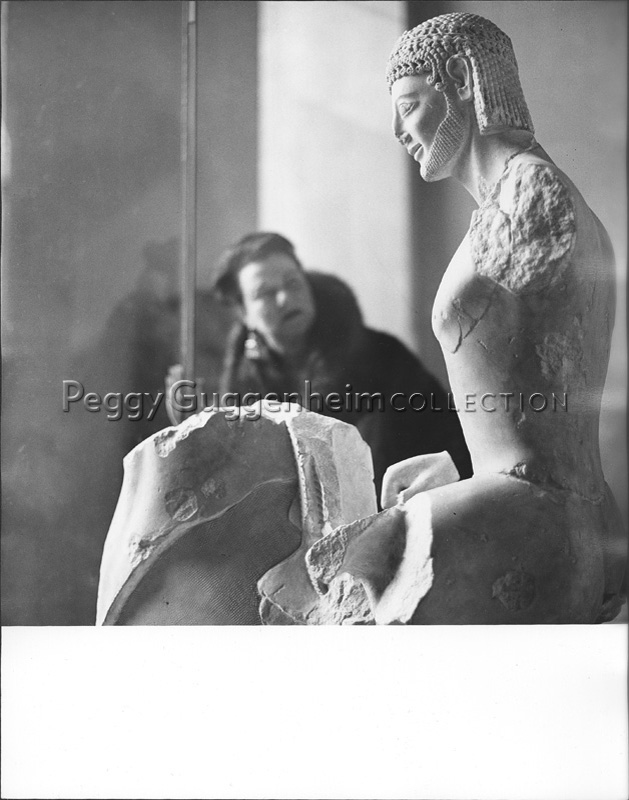 Peggy Guggenheim accanto ad una scultura greca antica (Cavaliere rampante, VI sec. a C.), esposta al Museo del Louvre. Anni '50
