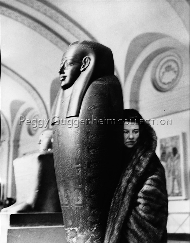 Peggy Guggenheim accanto ad una scultura egizia, esposta al Museo del Louvre. Anni '50.