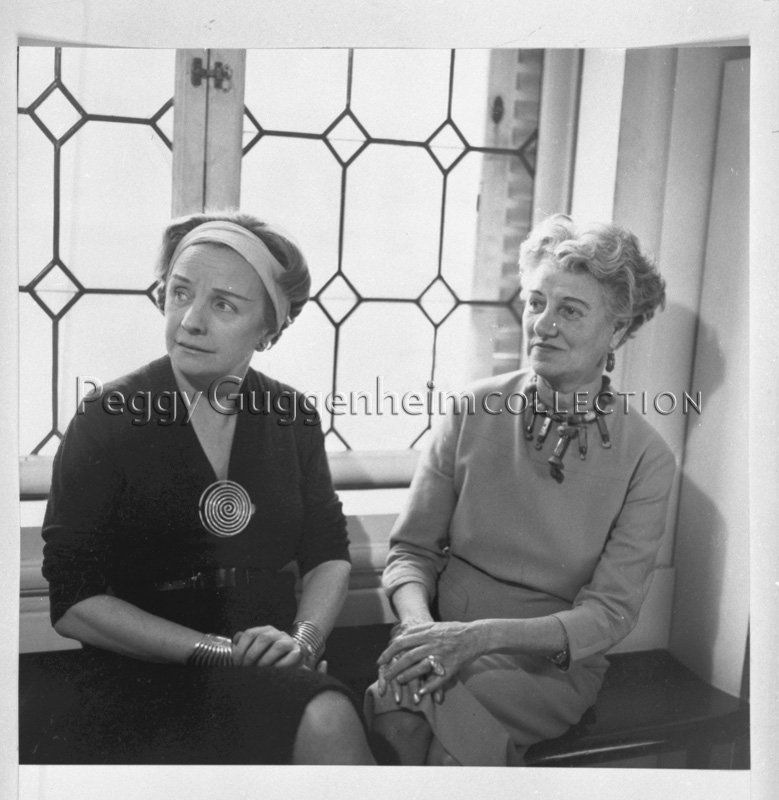 Peggy Guggenheim e Nelly van Doesburg sedute sotto la finestra della biblioteca di Palazzo Venier dei Leoni, anni '60