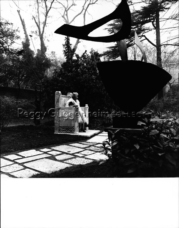 Peggy Guggenheim sul trono bizantino, nel giardino di Palazzo Venier dei Leoni, anni '60