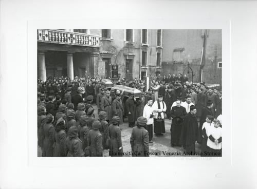 - NOTIZIE STORICO CRITICHE Fotografia individuata da Giannatonio Paladini nel 2001 e soggettata: "Funerali" (cartella n. 16). Sul medesimo supporto sono presenti anche le note manoscritte: "1943" e "Saggio Treccani n. 6". All'interno della cartella che contiene la fotografia compare anche una busta vuota di carta fotografica "ferrania" sulla quale è presente un timbro ad inchiostro blu ("4437/3") e si legge: "Società Anonima Ferrania / Industria per la fabbricazione dei prodotti sensibili / sede in Milano. 10 / 18x24 / Made in Italy / Vega / 108.A / Cartoncino normale [!] bromuro bianco brillante / Carton bromure blanc brillant normal / Bromsilber karton weiss glanzend normal / Double weight bromide paper white glossy normal / prezzo di vendita al pubblico L. 12,50 PROVV.TO MIN. CORP. P. 324 - 13 - 5 - 42 - XX.