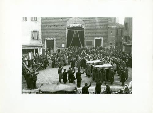 - NOTIZIE STORICO CRITICHE Fotografia individuata da Giannantonio Paladini nel 2001 e soggettata: "Funerali Antonio Marras 1943" (cartella n. 4). All'interno della cartella che contiene la fotografia compare anche una busta dell'Istituto Universitario di Economia e Commercio di Venezia (Venetiarum Schola - In Domo Foscari) sulla quale si legge la nota dattiloscritta: "Funerali Antonio Marras febbraio 1943.=".