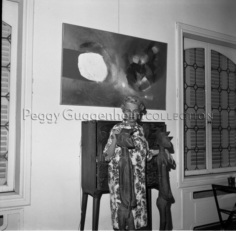 Peggy Guggenheim nel salotto di Palazzo Venier dei Leoni tra una coppia di sculture africane in legno; alle sue spalle Edmondo Bacci, "Avvenimeto #292" (1958, PGC); Venezia, 1973