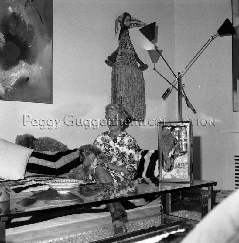 Peggy Guggenheim nella biblioteca di Palazzo Venier dei Leoni, alle sue spalle (da sinistra a destra) Edmondo Bacci, "Avvenimento #247" (1956, PGC), e una maschera della sua collezione di sculture dalle Americhe; sul tavolo Joseph Cornell, "Pappagallo che predice il futuro" (1937-38 c., PGC); Venezia, 1973