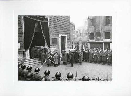 - NOTIZIE STORICO CRITICHE Fotografia individuata da Giannatonio Paladini nel 2001 e soggettata: "Funerali" (cartella n. 16). Sul medesimo supporto sono presenti anche le note manoscritte: "1943" e "Saggio Treccani n. 6". All'interno della cartella che contiene la fotografia compare anche una busta vuota di carta fotografica "ferrania" sulla quale è presente un timbro ad inchiostro blu ("4437/3") e si legge: "Società Anonima Ferrania / Industria per la fabbricazione dei prodotti sensibili / sede in Milano. 10 / 18x24 / Made in Italy / Vega / 108.A / Cartoncino normale [!] bromuro bianco brillante / Carton bromure blanc brillant normal / Bromsilber karton weiss glanzend normal / Double weight bromide paper white glossy normal / prezzo di vendita al pubblico L. 12,50 PROVV.TO MIN. CORP. P. 324 - 13 - 5 - 42 - XX.