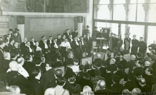 - NOTIZIE STORICO CRITICHE Fotografia individuata da Giannatonio Paladini e soggettata: "Inaugurazione locali dell'Istituto restaurati 1937" (cartella n. 21). Sul medesimo supporto è presente anche la nota manoscritta: "Saggio Treccani n. 1". Nella cartella contenente le fotografie, su un foglio di carta dell'epoca si legge la nota dattiloscritta: "Inaugurazione locali dell'Istituto restaurati (25 gennaio 1937)= =". Al foglio è allegata inoltre una bolla di commissione sulla quale si legge: "NUOVA EDITORIALE S. p. A. Agenzia Fotografica Industriale (AFI) Venezia San Marco, 5238 - Telefoni: 20227 - 22648. Duplicato Ordine N° 11114. Copia Commissione. Copie 18x24 N. 21 cerimonia a Ca' Dolfin. Il sottoscritto in nome della Ditta università Ca' Foscari dà ordinazione all'A.F.I. dei lavori qui sopra elencati e si dichiara responsabile del pagamento delle fatture relative. Venezia, li 14/3/61". Nella cartella contenente la fotografia è presente un cartellino sul quale si leggono, stampate, le informazioni: - Archivio Storico Serie Rettorato, Fondo Fotografie. Busta: "Inaugurazione locali dell'Istituto restaurati, 1937". Fotografia: inaugurazione di Ca' Foscari dopo i restauri Scarpa, 25/01/1937 (Foto Giacomelli). Riproduzioni: - CD-Rom "18 immagini ca' Foscari" / Studio Lanza, agosto 2004 (formato jpeg)file inaugurazione.jpg; - CD-Rom "6 fotografie 1937-1943" / G. Virgiliani Pesenti (ca' Foscari), luglio 2003 (formato TIF: 150, 600 e 1200 dpi)file TREC1.