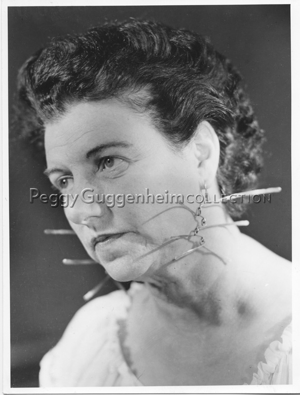 Peggy Guggenheim Wearing earrings made by Alexander Calder, 1949.