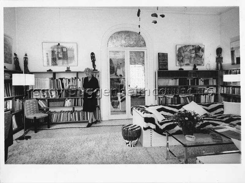 Peggy Guggenheim nella biblioteca di Palazzo Venier dei Leoni; alle pareti (da sinistra a destra) Tancredi, "Senza titolo" (1954, PGC), "Senza titolo" (1953, PGC); al soffitto Alexander Calder, "Mobile" (1934, PGC); Venezia, anni '60.