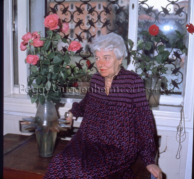 Peggy Guggenheim nella biblioteca di Palazzo Venier dei Leoni; accanto a un vaso di rose; Venezia, fine anni '70