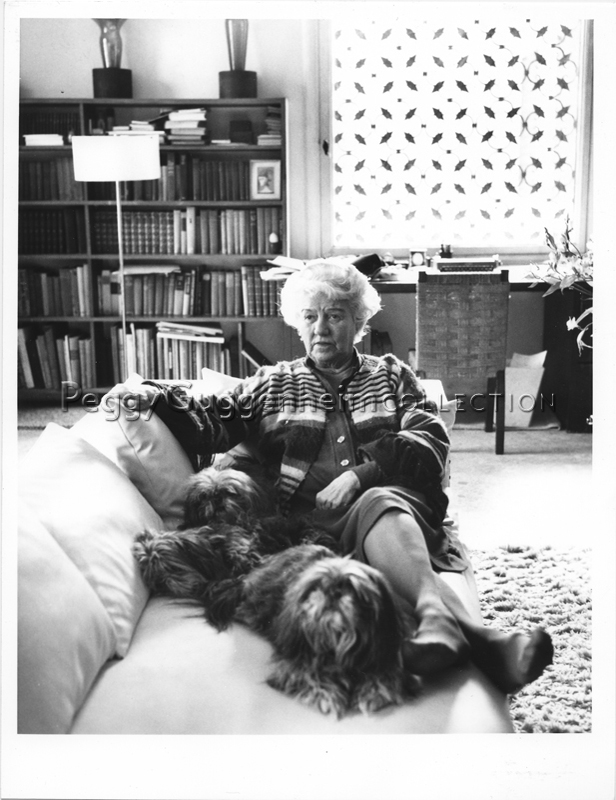 Peggy Guggenheim con i suoi terrier Lhasa Apsos nella biblioteca di Palazzo Venier dei Leoni, Venezia, anni '70