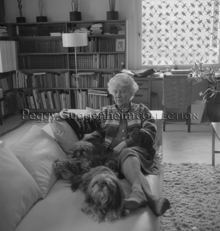 Peggy Guggenheim con i suoi terrier Lhasa Apsos nella biblioteca di Palazzo Venier dei Leoni, Venezia, anni '70
