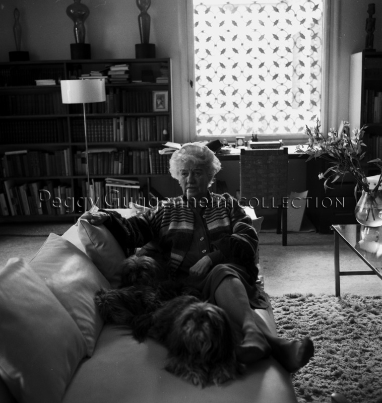 Peggy Guggenheim con i suoi terrier Lhasa Apsos nella biblioteca di Palazzo Venier dei Leoni, Venezia, anni '70