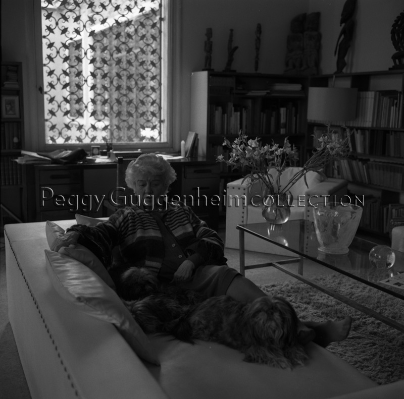 Peggy Guggenheim con i suoi terrier Lhasa Apsos nella biblioteca di Palazzo Venier dei Leoni, Venezia, anni '70