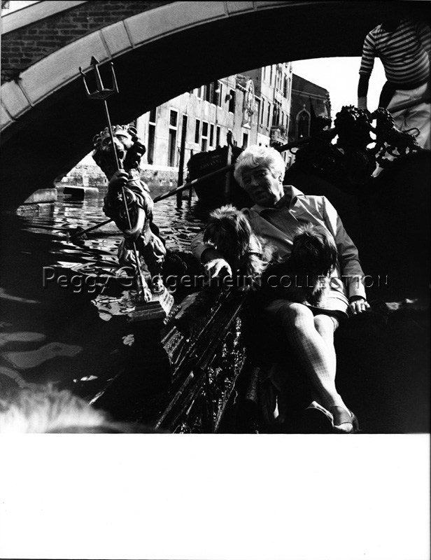 Peggy Guggenheim sulla sua gondola, in compagnia di alcuni dei suoi cani, fine anni '60