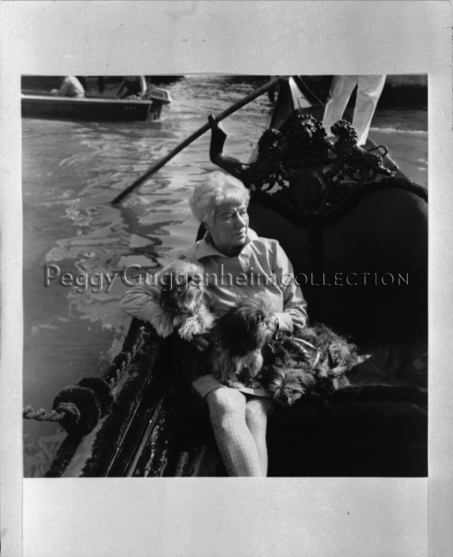 Peggy Guggenheim sulla sua gondola, in compagnia di alcuni dei suoi cani, fine anni '60