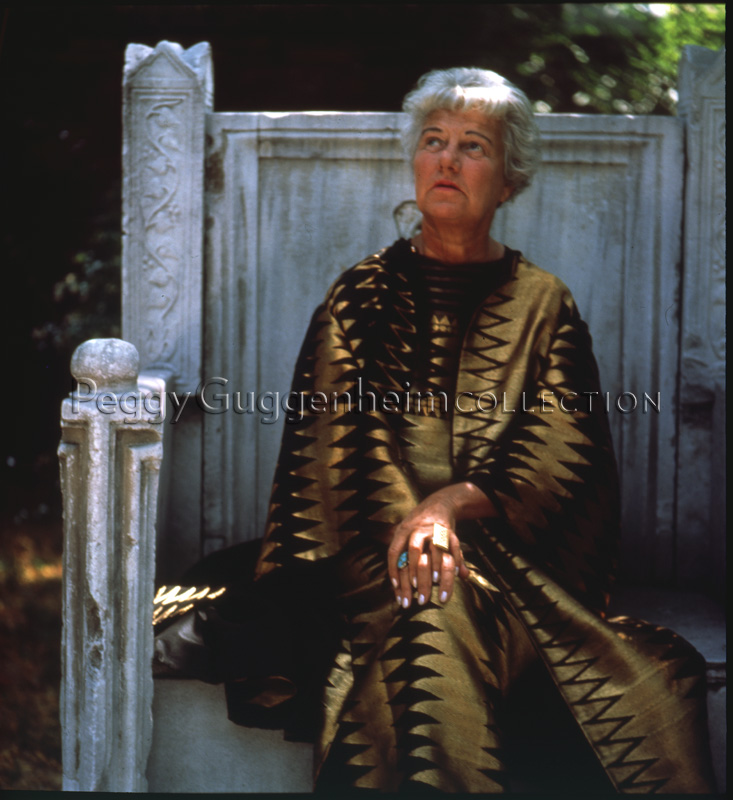 Peggy Guggenheim con un abito di Kenneth Scott, seduta in giardino a Palazzo Venier dei Leoni; Venezia, 1966 ca.