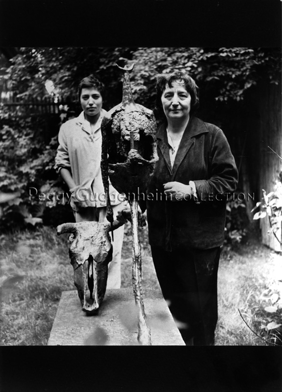 Germaine Richier and her niece Francoise Guiter in the garden of her studio next to Tauromachie (1953), Paris 1956