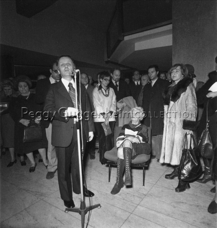 Peggy Guggenheim assiste ad un'orazione introduttiva, durante l'inaugurazione della mostra dedicata alla Collezione Peggy Guggenheim, presso la Galleria Civica d'Arte Moderna di Torino, dal dicembre 1975 al febbraio 1976