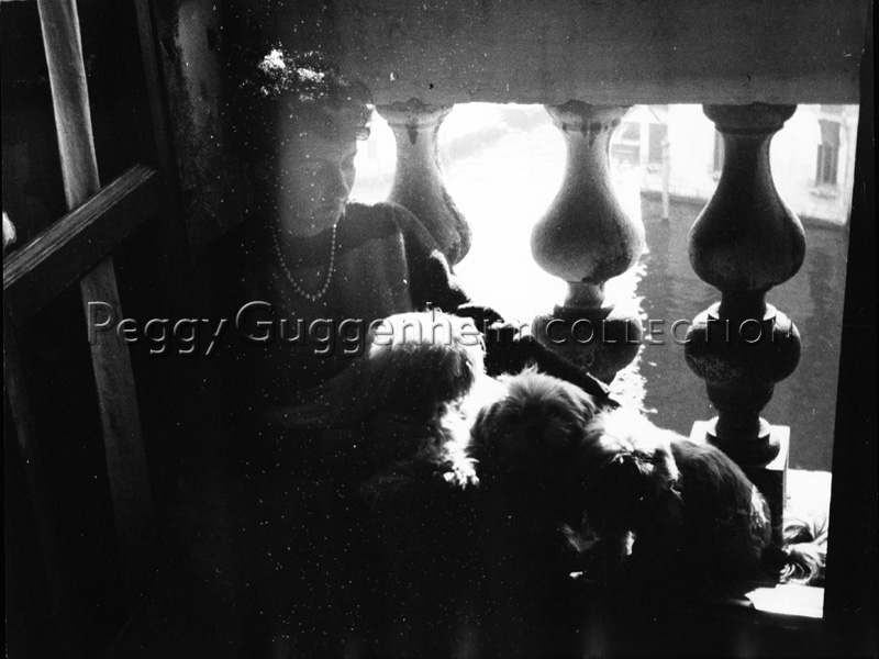 Peggy Guggenheim seduta sul balcone di un palazzo veneziano; anni '40