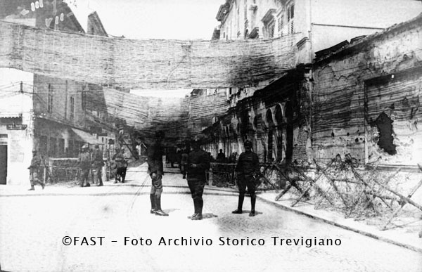 Soldati lungo una strada cittadina (Gorizia?) munita di apparati di mimetizzazione e di difesa