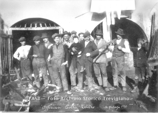 Ritratto di gruppo dei lavoratori della officina di Arturo Colla - denominata "el majo"- e di Antonio Lago, in periferia di Treviso, frazione San Pelaio. Da sinistra: Lago Agostino, Colla Silvio, Bonesso Giovanni, Colla Arturo (padre del proprietario della foto), bambino (forse il proprietario della foto).