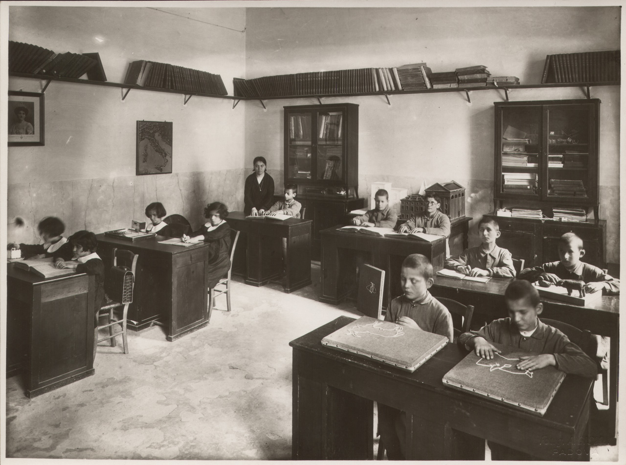 Foto di un gruppo di ragazzi di un istituto per ciechi durante una lezione in classe.