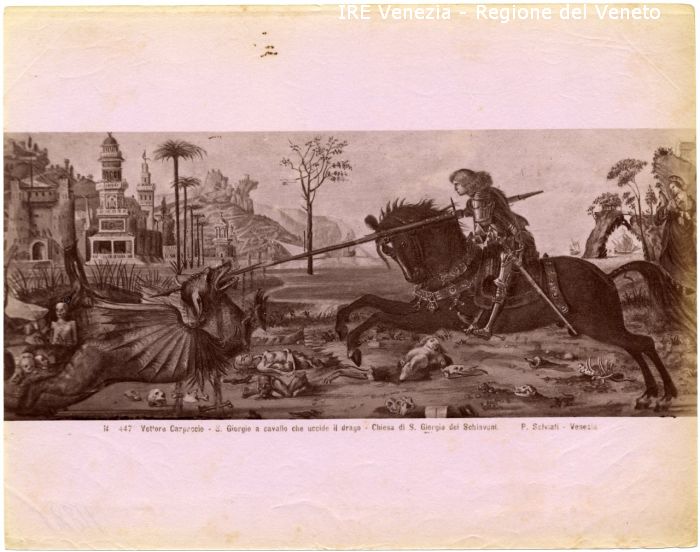 - ISCRIZIONI sul recto: in basso - N. 447 Vettore Carpaccio - S. Giorgio a cavallo che uccide il drago - Chiesa di S. Giorgio dei Schiavoni./ P. Salviati - Venezia - a matita -