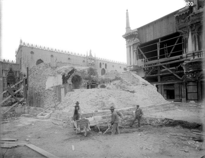 Venezia, le macerie del campanile di San Marco con gli operai
