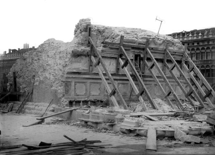 Venezia, le macerie del campanile di San Marco, basamento puntellato durante i lavori di recupero