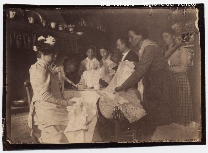 Venezia - Vita veneziana e lagunare - Scene e costumi - Produzione di merletti - Località non identificata (Murano ?) - Abitazione privata: cucina - Signore: eleganti; sedute a tavola - Vendita di merletti