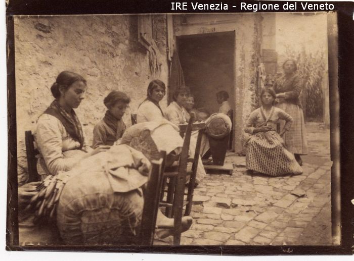 Venezia - Vita veneziana e lagunare - Scene e costumi - Momenti di vita quotidiana - Produzione di merletti - Località non identificata (Murano ?) - Corte - Donne: al tombolo - Merlettaie
