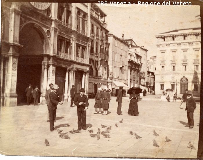 Venezia - Vita veneziana e lagunare - Scene e costumi - Turismo - Piazza S. Marco: verso Torre dell'Orologio e Piazzetta dei Leoncini - Turisti con piccioni - Due guardie - Passanti