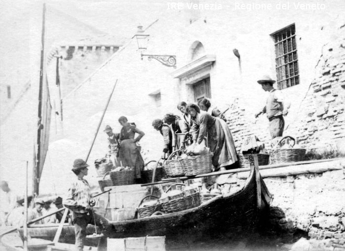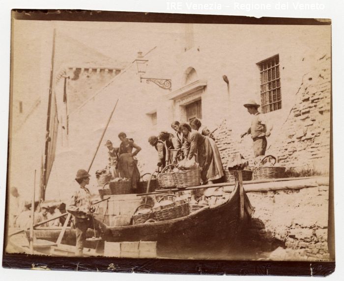 Venezia - Vita veneziana e lagunare - Scene e costumi - Momenti di vita quotidiana - Fondamenta non localizzata ( Misericordia ?) - Donne su una riva - Ceste con ortaggi - Imbarcazione: peata