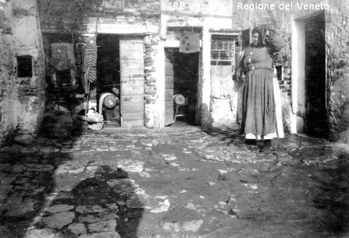 Venezia - Vita veneziana e lagunare - Scene e costumi - Momenti di vita quotidiana - Produzione di merletti - Località non identificata (Murano ?) - Corte - Abitazioni: ingresso - Donne al tombolo - Merlettaie